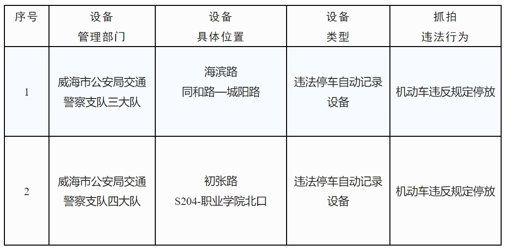 為保證道路交通安全,預(yù)防和減少交通事故的發(fā)生,根據(jù)《中華人民共和國道路交通安全法》及其實施條例等法律法規(guī)和相關(guān)技術(shù)規(guī)范的規(guī)定,依據(jù)《公安機關(guān)執(zhí)法公開規(guī)定》,現(xiàn)將威海市新增2處交通技術(shù)監(jiān)控設(shè)備予以公示,自6月3日起,將對有關(guān)交通違法行為進(jìn)行依法管理,請廣大交通參與者自覺遵守道路交通安全法律法規(guī),共同維護良好的道路交通環(huán)境。
