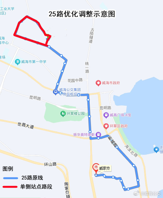 威高花園樞紐站改為途經(jīng)站,調(diào)整后,25路改為戚家夼環(huán)行運(yùn)行,由戚家夼發(fā)車,按原線運(yùn)行至威高時(shí)光城站點(diǎn)后,改行宮松嶺路、遠(yuǎn)遙墩路、臥龍山路、宮松嶺路按原線路返回戚家夼站點(diǎn)。威高花園區(qū)域站點(diǎn)調(diào)整為單側(cè)??俊?/p>