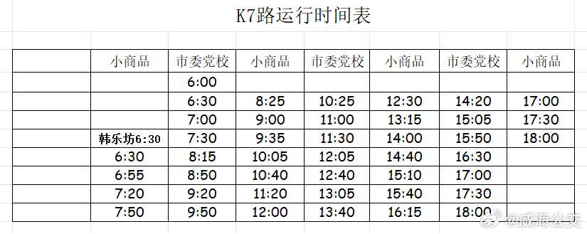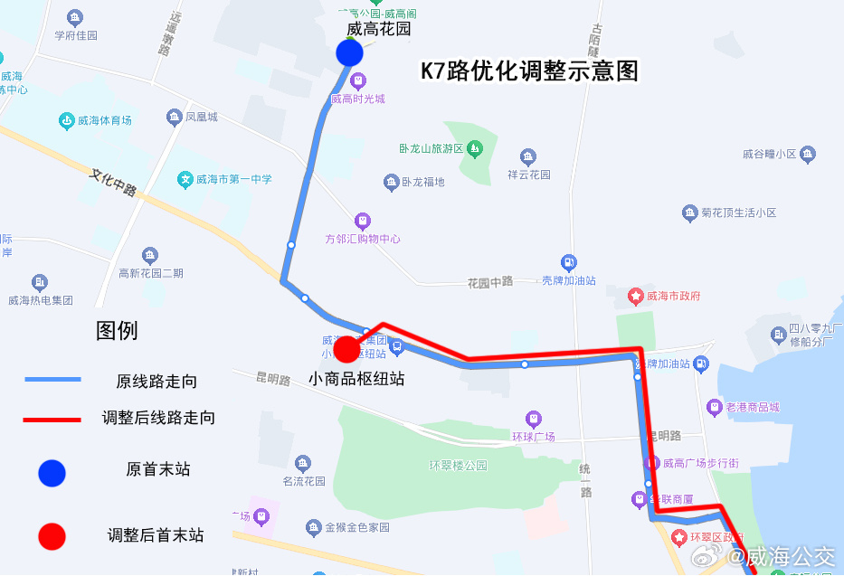 調(diào)整后,K7路由市委黨校發(fā)車,按原線路運(yùn)行至小商品樞紐站,取消威高花園、神道口、市民卡環(huán)翠服務(wù)中心、小商品市場(chǎng)4個(gè)站點(diǎn)。