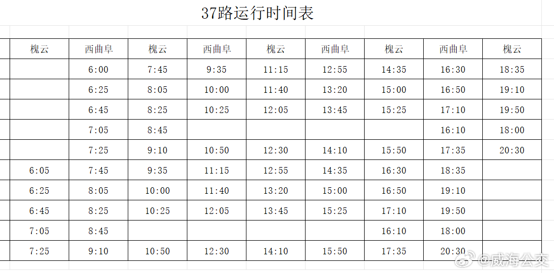 調(diào)整后,37路由西曲阜發(fā)車,按原線路運(yùn)行至威高時(shí)光城站點(diǎn),改行宮松嶺路、遠(yuǎn)遙墩路、花園中路、福山路至槐云村站點(diǎn),取消威高花園1個(gè)站點(diǎn),增設(shè)威高醫(yī)院、欽村小學(xué)、西欽村、體育場(chǎng)北、槐云村5個(gè)站點(diǎn)。